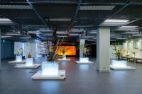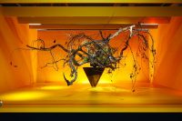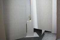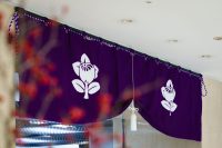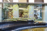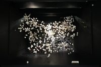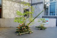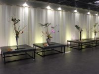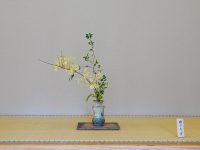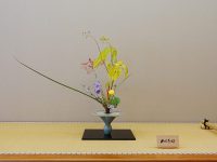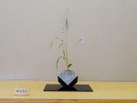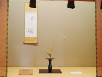 青年部代表在天花板上懸掛多張和紙狀薄片,營造出印象深刻的白色花席,並於其中展示了以素雅草木構成的插花。展期中更換花材,共進行了三次插花替換。